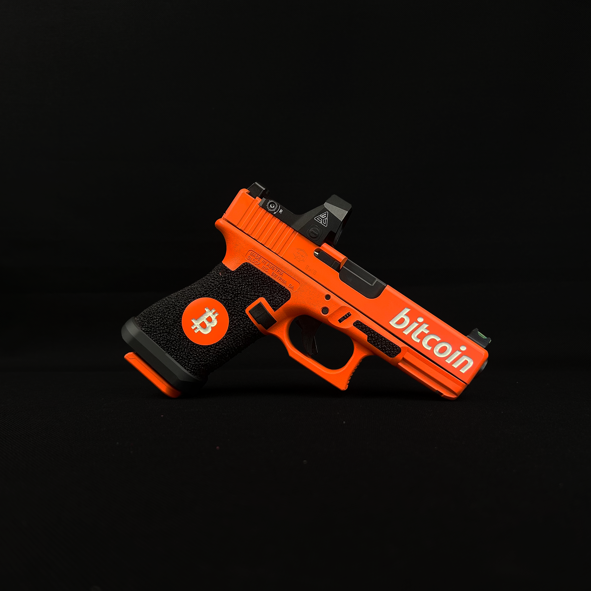 - Finish: Cerakote Bitcoin Orange with custom engravings