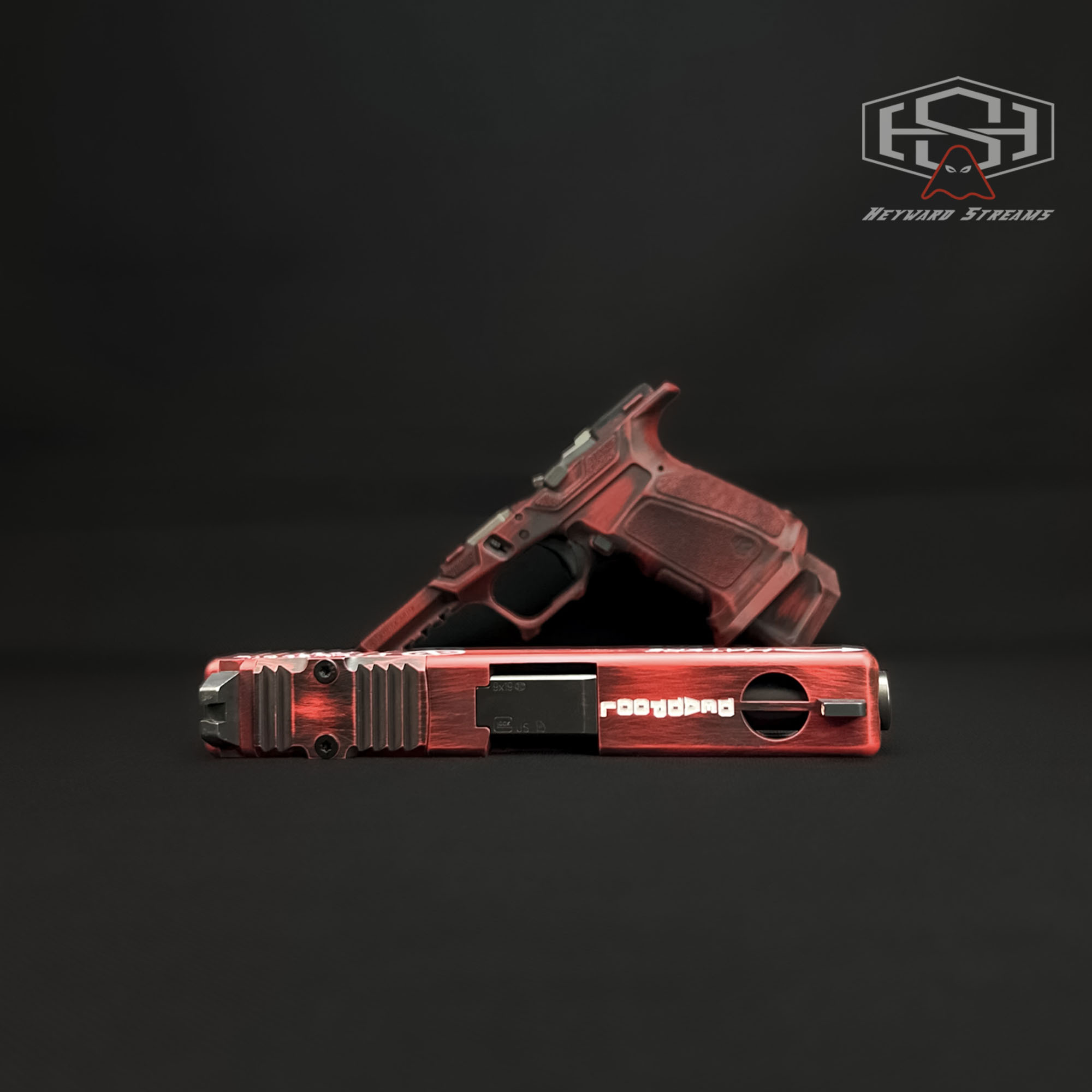 - Slide: OEM Glock Style 19 Platform, Deadpool Cerakote, Engraved Artwork